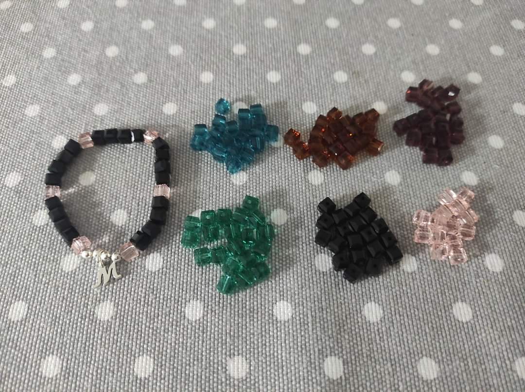 Pulsera elástica con abalorios de cristal checo intercalada con zamak e inicial.