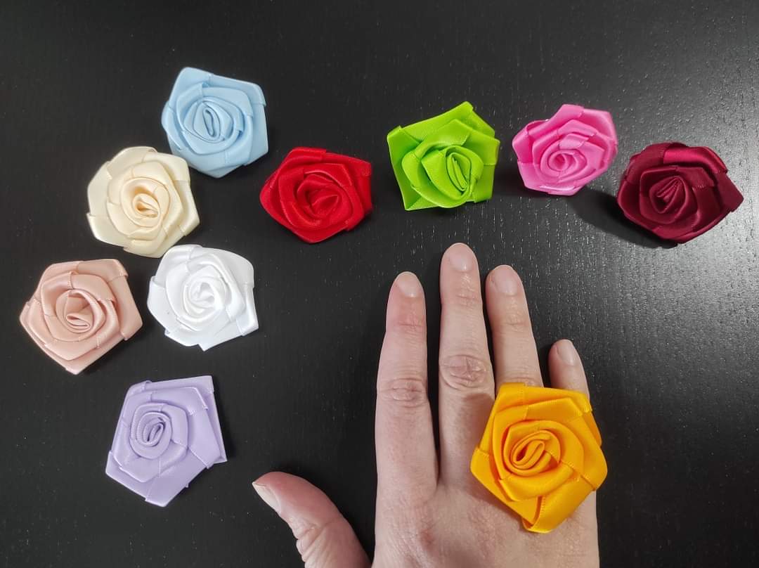 Vistoso anillo ajustable de bisutería con una gran rosa de raso que llama la atención.